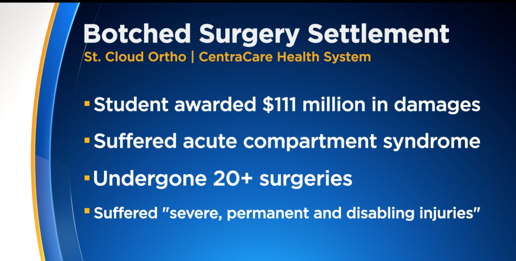 A Minnesota federal jury found a St. Cloud medical center botched the surgery of a then-19-year-old college student in a procedure that left “catastrophic” damage to his left leg, and awarded him over $111 million in damages.